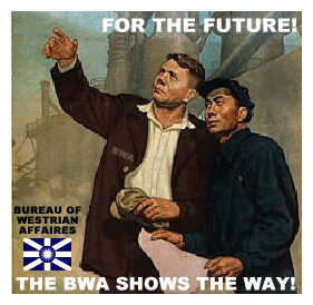FOR CENTURIES THIS SITUATION EXISTED, AND ALTHOUGH THERE WERE REGIONAL ASSOCIATIONS OF WESTRIANS IN 16 COUNTRIES, TRYING TO PROVIDE A CULTURAL AND SOCIAL ENTITY TO LINK TO, WESTRIANS BEGAN TO REALIZE THAT THEIR CULTURE, LANGUAGE, AND WAY OF LIFE WAS IN DANGER OF BEING DILUTED TO THE POINT OF INDISTINGUISHABILITY. IT WAS THUS IN THE YEAR 275 AP THAT THE BUREAU OF WESTRIAN AFFAIRES (BWA) WAS FORMED.