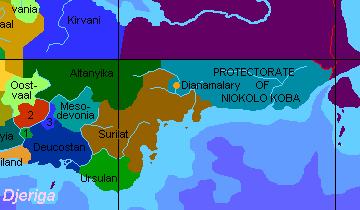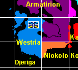 BY COINCIDENCE, WESTRIANS HAD NOW GAINED NOT ONLY THE SO LONG PROMISED AND ELUSIVE HOMELAND, BUT IN FACT TWO NATIONS WERE NOW UNDER WESTRIAN ADMINISTRATION. THE GENIAL CHIEF CARTOGRAPHER OF THE BWA, NIKO STERNSBERGEN, ORIGINATED THE IDEA OF PROPOSING TO TRADE SOME OF THE UNINHABITED AND RATHER RUGGED SOUTHERN LANDS OF THE TERRITORY OF THE BWA TO ARMATIRION, IN EXCHANGE FOR MORE LAND FOR THE NEW WESTRIAN HOMELAND IN NEW ARMATIRION, IN THE REGION SO IMPORTANT TO WESTRIANS THROUGH THEIR AGE-OLD PROPHECY. A TREATY PROPOSAL WAS PREPARED AND EXTENDED TO PRESIDENT ELGSAAS, WHO, AFTER DUE DEBATE WITH HIS CABINET, AGREED TO REDRAW THE BOUNDARIES OF WESTRIA, ARMATIRION AND THE TERRITORY OF THE BWA TO WHAT THEY ARE AT THIS POINT IN TIME (SEE GEOGRAPHY). THE NEW BOUNDARIES OF THE TERRITORY OF THE BWA ARE SHOWN IN THE MAP BELOW (THE LIGHT BLUE AREA LABELED 'WESTERMARC'):